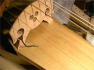 < The tailpiece – pegbox of the Alouette model. the Goto tuners are precise and easy to handle. To work at night : the headphones.